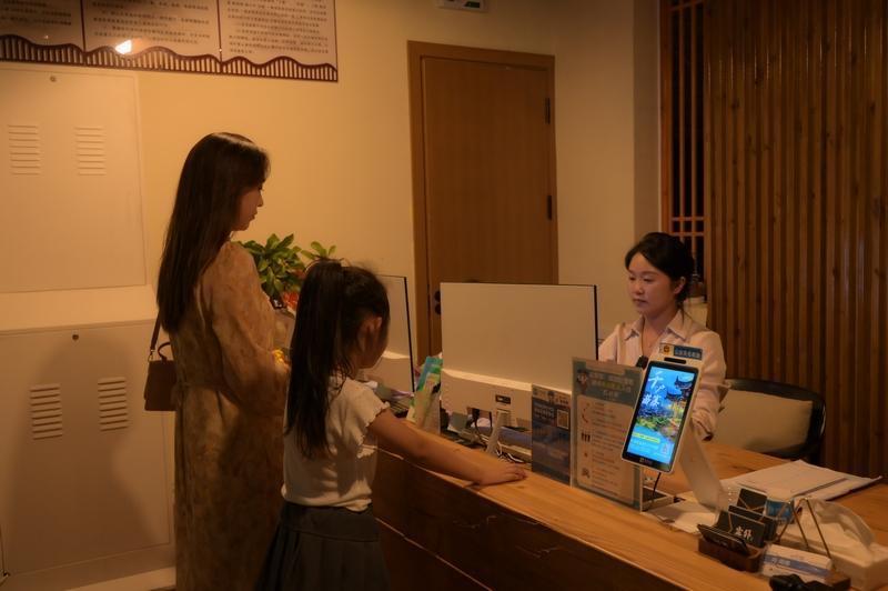 在长岗镇蔺田村尘外楠山民宿接待大厅内,前来办理入住的游客络绎不绝,工作人员一边高效登记信息,一边主动向游客介绍民宿周边的打卡点位,不少游客被这里的田园风光和特色体验所吸引。